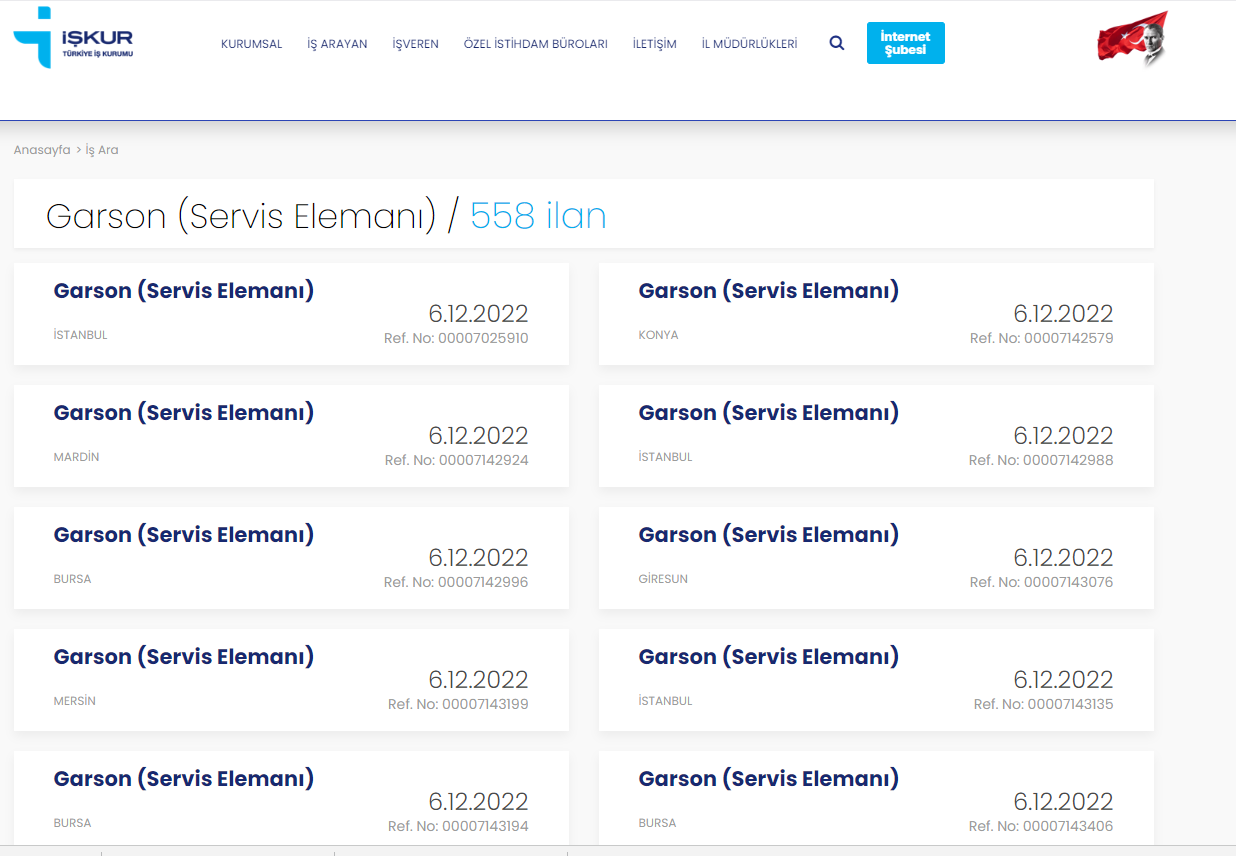 Garson (Servis Elemanı) işi için alım ilanı işkur web sayfasında yayınlandı. Türkiye iş kurumu tarafından Garson (Servis Elemanı) alım ilanı paylaştı. İşkur Garson (Servis Elemanı) İşi konusunda yetenekli olanlar ve bu alanda ilerlemek isteyen kişiler için Garson (Servis Elemanı) alım ilanı başvuruya açıldı. Garson (Servis Elemanı) olarak çalışmak isteyenler şart ,koşul ve belirtilen illerde başvuruda bulunabilirler.