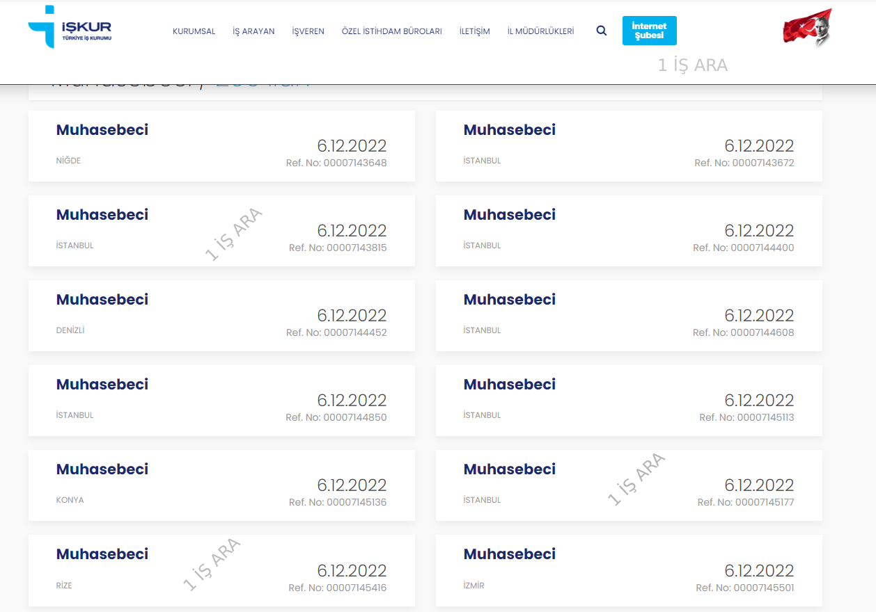 Bu şartlar, başvuru yapabileceğiniz bir çok ilana göre değişiklik gösterebilir. İşkur web adresi üzerinden Muhasebeci alım ilanı iş ilanları sayfasını inceleyebilir, sizin için en uygun işleri bulabilirsiniz.
